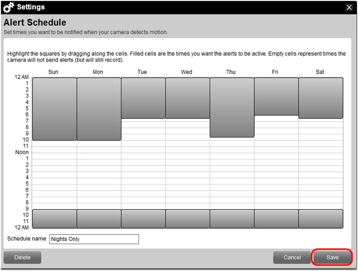 Щелкните раскрывающийся список Schedule (Расписание), чтобы просмотреть доступные варианты расписаний для камеры.